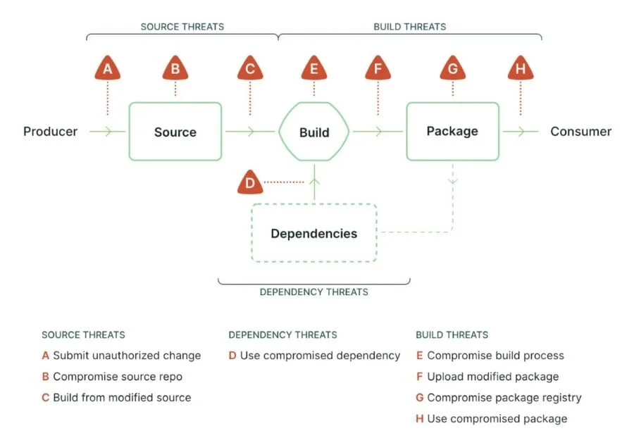 The artifact attribute namespace had multiple attributes for its first implementation. One key set of attributes within this namespace cover attestations that closely align with the SLSA model. This is really the first time a direct connection is being made between observability and software supply chain security. Consider the following supply chain threat model defined by SLSA:
